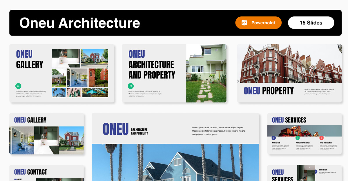 Presenta i tuoi progetti con sicurezza utilizzando il modello PowerPoint Oneu Architecture and Property : una presentazione moderna, professionale e completamente personalizzabile, pensata per architetti, professionisti del settore immobiliare, sviluppatori immobiliari e imprese di costruzione. Progettato con layout puliti e grafica di alta qualità, questo modello ti aiuta a presentare il tuo portfolio, le tue proposte e i tuoi report con chiarezza e impatto.