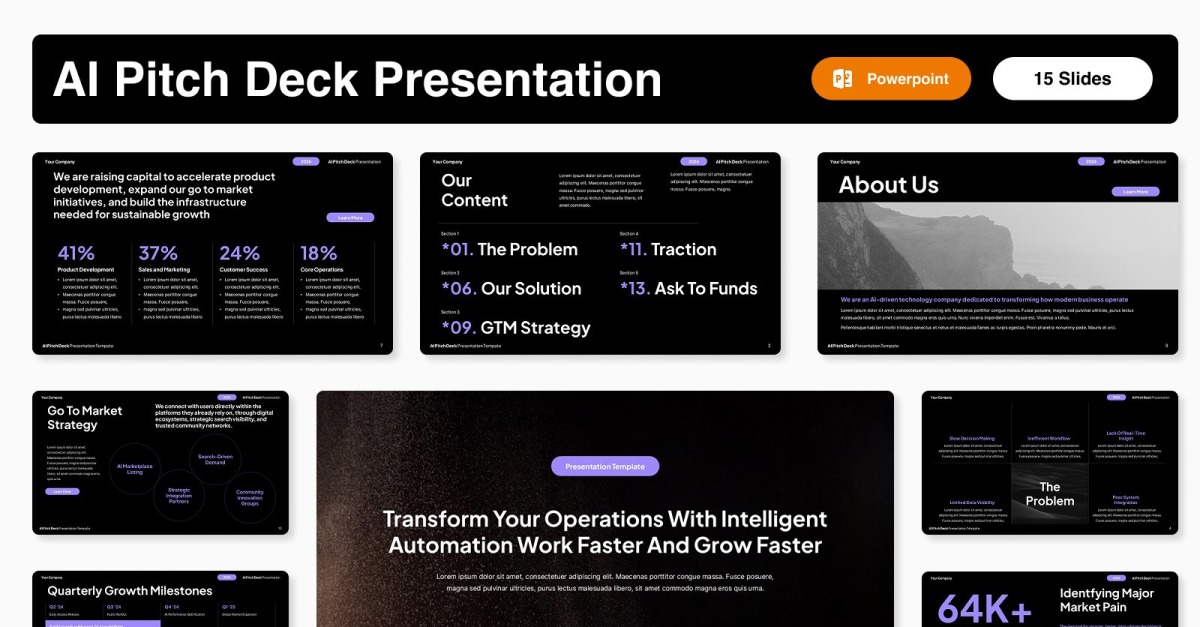 Il modello di presentazione PowerPoint "AI Pitch Deck" è una presentazione moderna e di grande impatto, pensata per startup tecnologiche, aziende di intelligenza artificiale, progetti di apprendimento automatico e presentazioni aziendali innovative. Realizzato con layout puliti e uno stile futuristico, questo modello ti aiuta a creare una narrazione avvincente che cattura l'attenzione degli investitori fin dalla prima diapositiva.