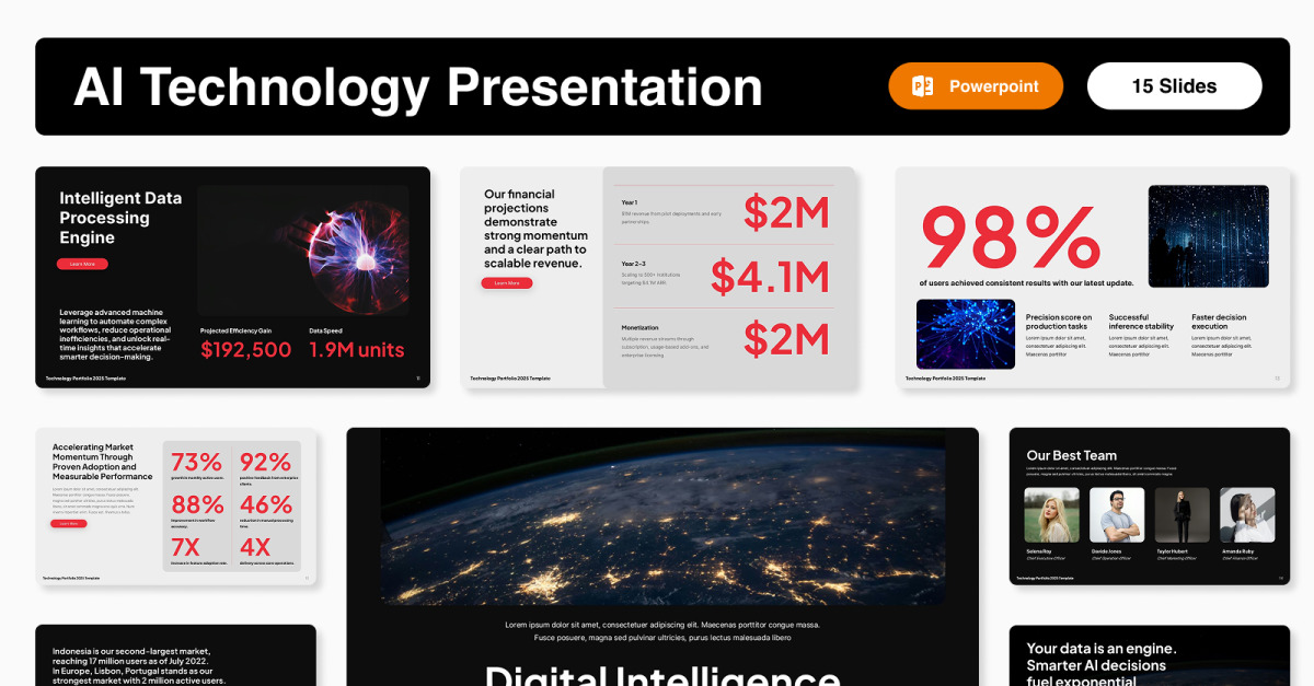 Tutte le slide sono completamente modificabili: personalizza colori, font, grafici, icone e immagini in base all'identità del tuo brand. Ideali per presentazioni di intelligenza artificiale, pitch tecnologici, demo di prodotto, report sull'innovazione, conferenze e riunioni con gli investitori.