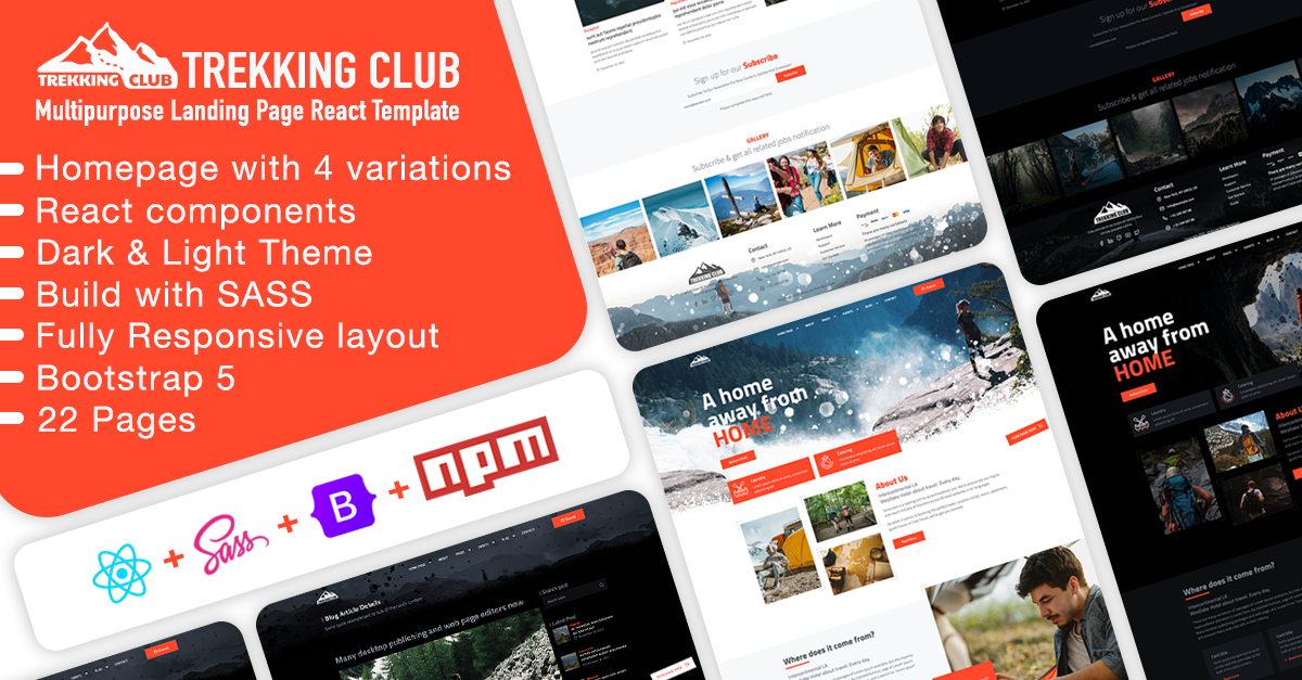 Trekking Club è un template realizzato con tecnologia React, disponibile nelle versioni dark e light, realizzato con la massima cura dei dettagli utilizzando le ultime tecnologie disponibili e adatto alla visualizzazione dei contenuti su tutti i dispositivi.