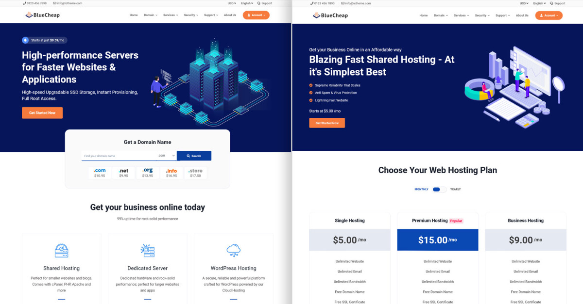 Questo tema dall'aspetto brillante è una soluzione completa per tutti i tipi di servizi aziendali. Come suggerisce il nome, BlueCheap Host' è un professionista nel prendersi cura di tutti i servizi relativi al web hosting. Il tema WHMCS di BlueCheap Host combina i migliori effetti visivi e abilità funzionali. Il tema reattivo è alimentato da BootStrap per caricarsi in un batter d'occhio. Il tema reattivo e compatibile con più browser è inoltre ottimizzato per adattarsi all'interfaccia utente del touch screen, garantendo un'ampia portata e un'esperienza uniforme. Il tema è dotato di schede personalizzate sulle pagine dei prodotti, moduli di contatto e documentazione estesa per migliorare ulteriormente l'impatto. Il tema facilmente personalizzabile ha un design moderno e contiene oltre 20 pagine.