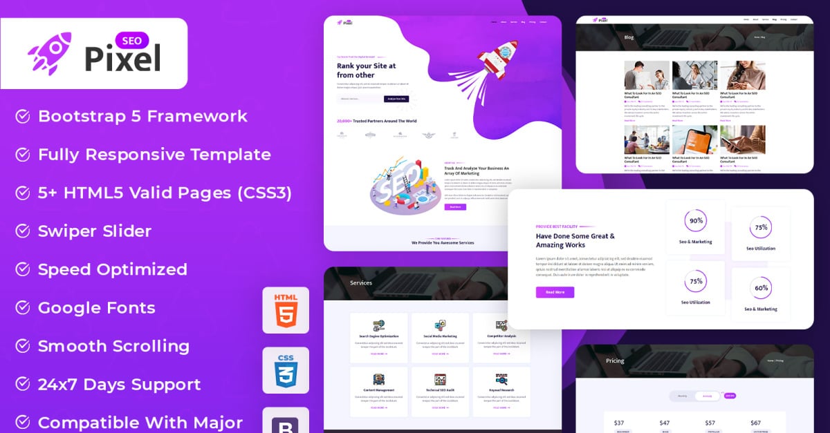 Ogni società di pubblicità aziendale simile, società che fornisce servizi SEO, servizi di marketing aziendale e società di servizi di consulenza troverà il modello HTML SEO perfetto per i propri siti Web aziendali.