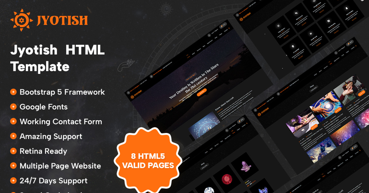 Il modello HTML Jyotish ha 8 pagine HTML, create con Bootstrap 5 Framework, con caratteri Google con compatibilità con i principali browser.