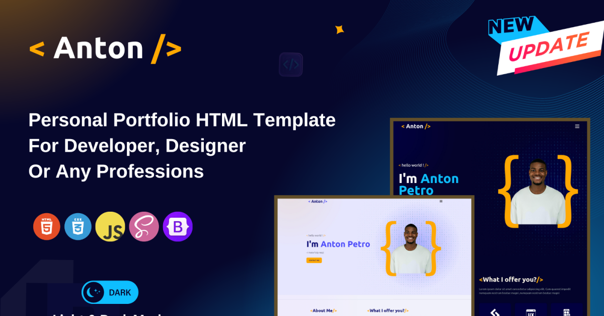 Anton - Modello HTML di portfolio versatile per sviluppatori, designer e professionisti creativi