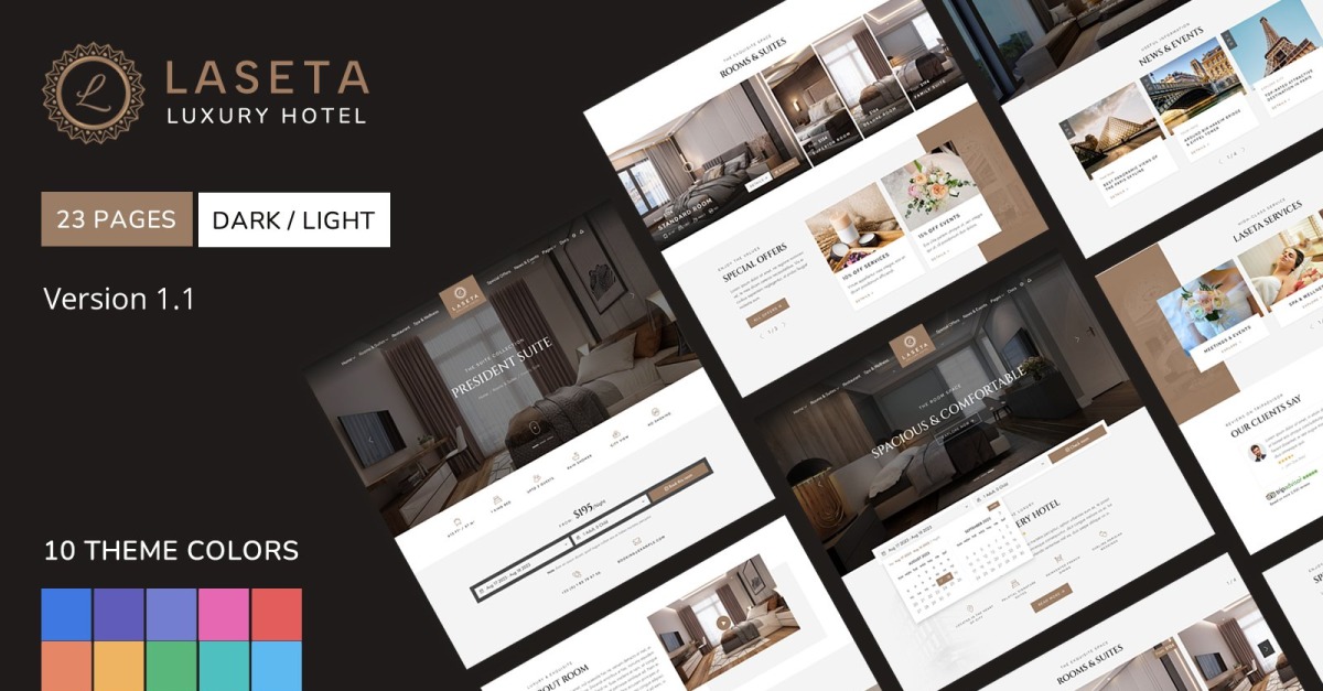 Laseta è un modello di sito web di hotel lussuoso e moderno, meticolosamente progettato per offrire agli utenti un'esperienza straordinaria. Il modello è composto da 35 pagine HTML con 2 opzioni Modalità scura/Modalità chiara e 12 colori tematici , che comprendono home page, informazioni, stanze, servizi, notizie, contatti e varie altre pagine. Costruito con HTML5, CSS3 e Javascript puro e (aderisce agli standard W3C ). Il modello utilizza esclusivamente plug-in Javascript puri evitando dipendenze, risultando in un codice leggero e più veloce. Costruito sulla base di Bootstrap 5.3 , il framework di interfaccia del sito Web più diffuso oggi, il modello garantisce un design reattivo e visivamente accattivante.