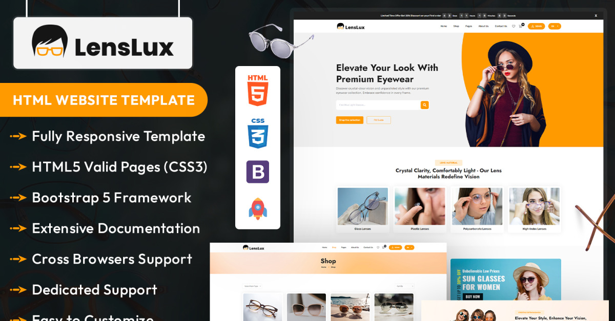 LensLux è un elegante modello HTML progettato appositamente per attività legate a lenti, ottica, ottici e occhiali. Questo sito Web accattivante offre una soluzione pronta all'uso destinata a migliorare la visibilità online e il coinvolgimento dei visitatori. Viene fornito con una pagina HTML 5 valida, l'ultimo supporto WordPress, un modulo di contatto funzionante.