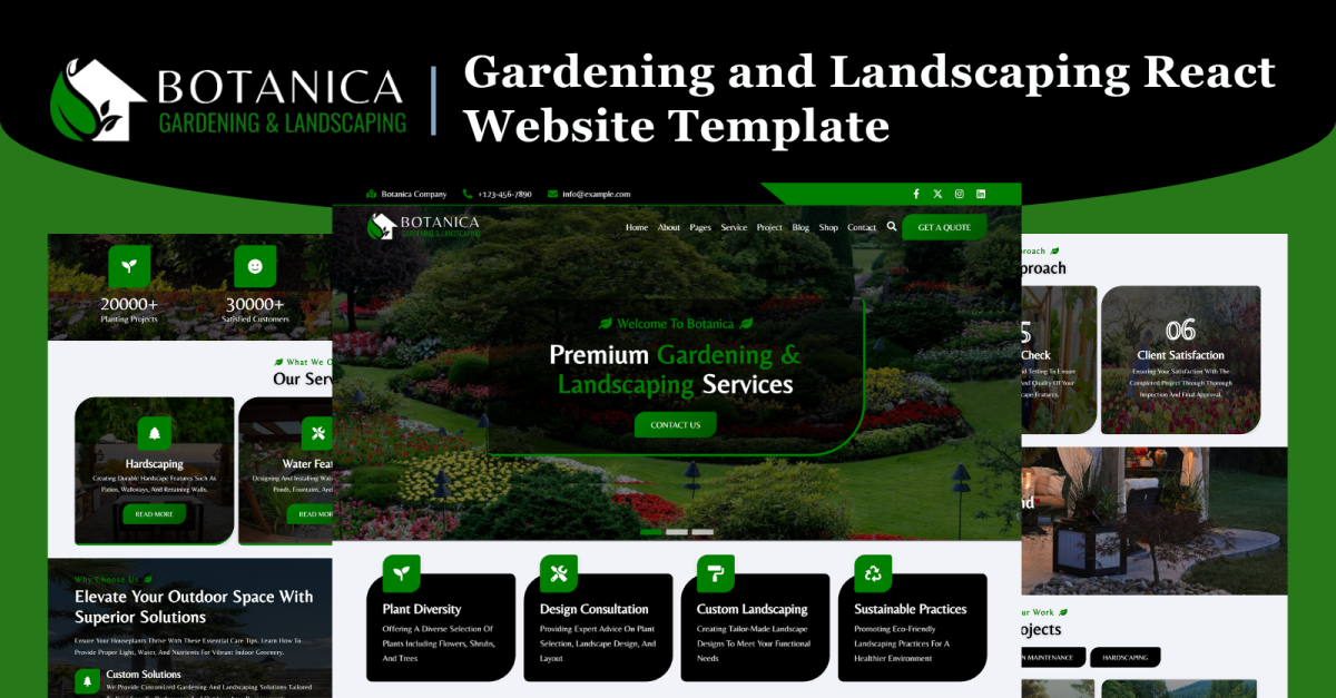 Botanica è un modello di sito web moderno e ricco di funzionalità basato su React, creato appositamente per le aziende di giardinaggio, progettazione paesaggistica e progettazione di spazi all'aperto. Realizzato con React.js, CSS3 e JavaScript, offre un'esperienza utente fluida e ad alte prestazioni, pensata su misura per giardinieri, paesaggisti, vivaisti e architetti di spazi all'aperto . Con un design elegante e accattivante, Botanica consente alle aziende di mostrare la propria competenza, attrarre più clienti e stabilire una forte presenza digitale.