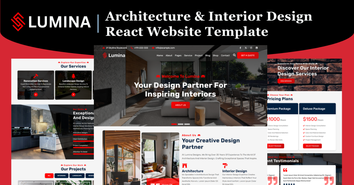 Lumina è un template per siti web premium basato su React , pensato appositamente per studi di architettura e interior design moderni che desiderano migliorare la propria presenza digitale. Sviluppato con una struttura React.js semplificata, JavaScript e uno stile CSS3 completamente adattabile , garantisce prestazioni veloci, interazioni fluide e una reattività impeccabile su ogni dispositivo. Ideale per presentare portfolio di design dettagliati, concept di interni, rendering architettonici e progetti di ristrutturazione, il layout di Lumina, visivamente accattivante, è progettato per stupire e coinvolgere. L'interfaccia incentrata sull'utente, l'estetica curata e le sezioni incentrate sui contenuti consentono ai visitatori di scoprire facilmente i tuoi servizi, consultare progetti passati e avviare consulenze. Che si tratti di clienti privati, sviluppatori commerciali o appassionati di design, Lumina posiziona il tuo brand come visionario, affidabile e impegnato nell'eccellenza del design.