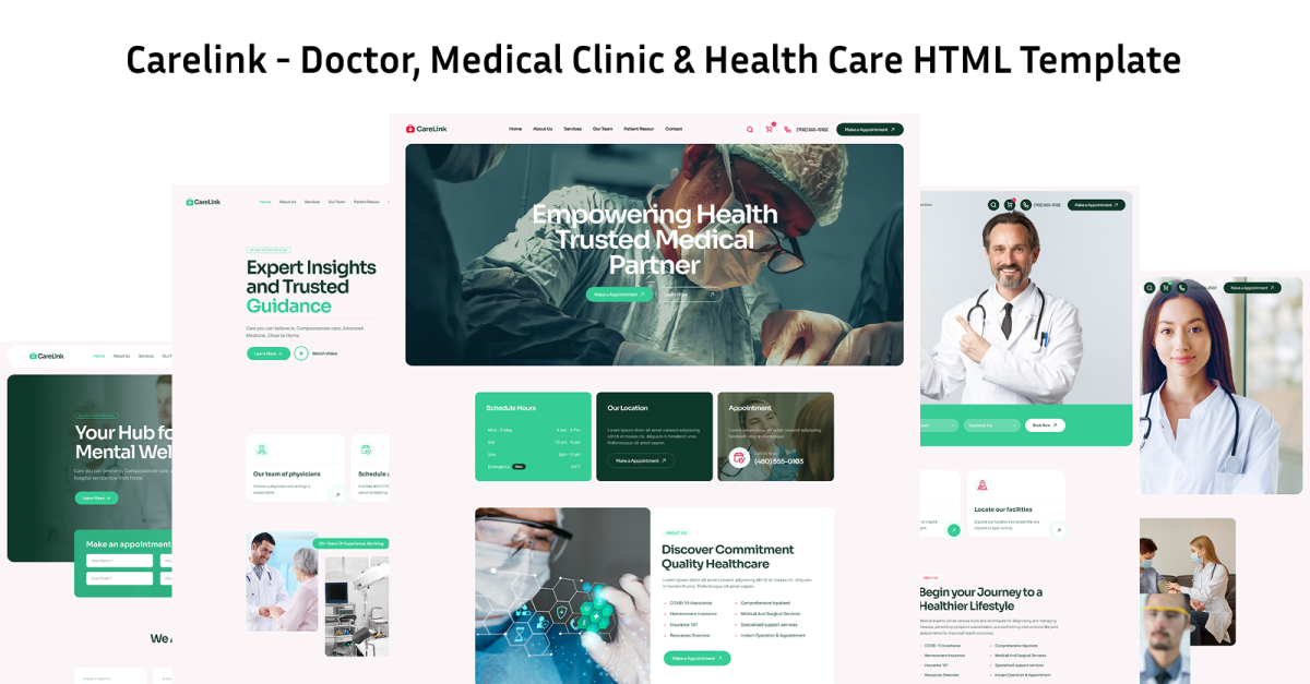 Carelink è un template HTML moderno, pulito e completamente responsive, creato appositamente per professionisti del settore medico, cliniche, ospedali e centri sanitari. Che tu stia creando un sito web per un medico privato, uno studio dentistico, un centro pediatrico, un laboratorio diagnostico o un grande ospedale, Carelink offre un design professionale e intuitivo per presentare i tuoi servizi con sicurezza. Questo template presenta un codice ben organizzato, un layout ottimizzato per i dispositivi mobili, compatibilità multi-browser e animazioni fluide per garantire un'esperienza utente eccellente su tutti i dispositivi. Realizzato con HTML5, CSS3 e Bootstrap, Carelink è facile da personalizzare e adattare al tuo brand. Con pagine dedicate ai servizi, moduli per appuntamenti, sezioni di contatto e layout per blog accuratamente progettati, è la scelta ideale per creare un sito web medico affidabile e informativo.