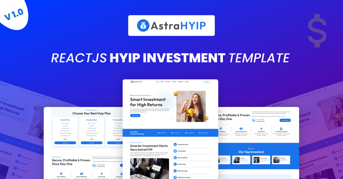 AstraHYIP è un modello di dashboard professionale in React JS progettato per piattaforme HYIP, siti web di investimento e servizi finanziari digitali. Presenta un'interfaccia utente moderna, pulita, intuitiva e completamente reattiva su tutti i dispositivi. Sviluppato con ReactJS, AstraHYIP è ideale per creare piattaforme di investimento ad alte prestazioni con una navigazione fluida e componenti UI riutilizzabili.