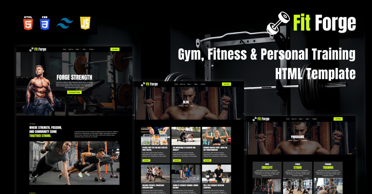 FitForge – Gym, Fitness & Personal Training Tailwind CSS HTML Template è un template audace, moderno e completamente responsive, pensato per palestre, centri fitness, club di bodybuilding, centri yoga e personal trainer. Con i suoi layout dinamici, il design accattivante e la struttura professionale, FitForge ti aiuta a presentare con facilità programmi di fitness, profili di trainer, piani di abbonamento, sedi di palestre e storie di successo dei clienti.