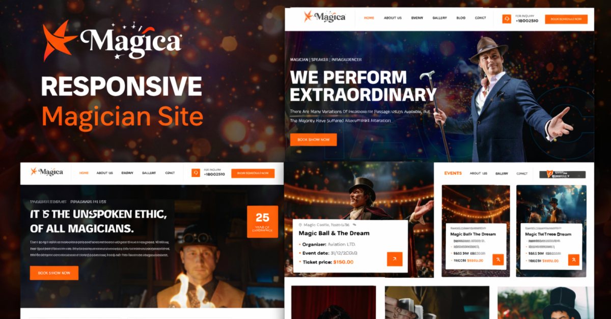 Con immagini accattivanti e potenti funzionalità di coinvolgimento, Magician dà vita alla tua performance online e ti aiuta a convertire i visitatori in fan e clienti fedeli. Che tu stia appena iniziando o stia trasformando il tuo spettacolo in un'attrazione di successo, questo modello ti offre gli strumenti per brillare più che mai.