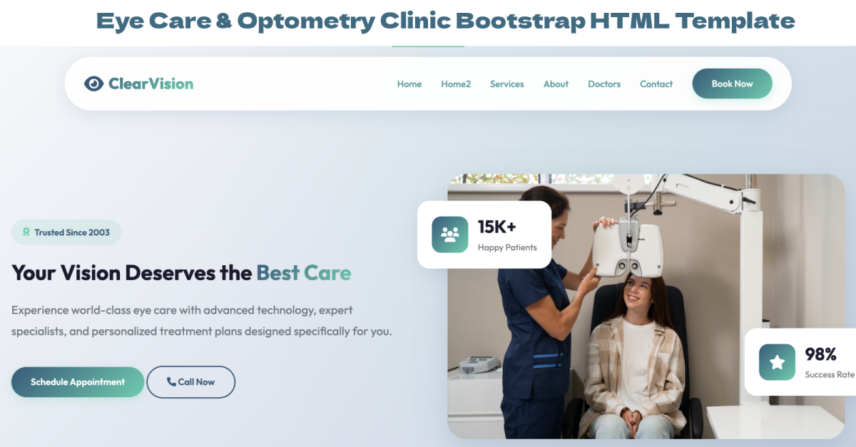 ClearVision è un modello HTML moderno, pulito e professionale, progettato appositamente per cliniche oculistiche, oftalmologi, optometristi, centri LASIK e aziende del settore sanitario .