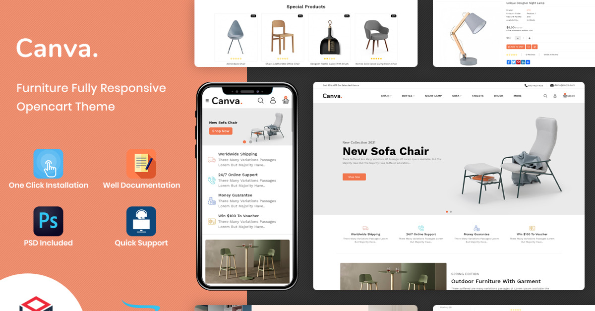 Canva è un tema OpenCart responsive per arredamento e interni. È realizzato con la massima precisione, in modo professionale, e lascia un'impressione positiva e duratura. Il tema OpenCart Canva Responsive è progettato perfettamente per negozi di arredamento, creativi, arredamento, decorazioni, interni, abbigliamento e multiuso. Ha un aspetto gradevole e professionale con una combinazione di colori impeccabile. È molto bello con il suo aspetto pulito e professionale. Supportando l'ultima versione di OpenCart 3.0.x, questo tema offre tutte le funzionalità di un template moderno per qualsiasi sito di e-commerce.