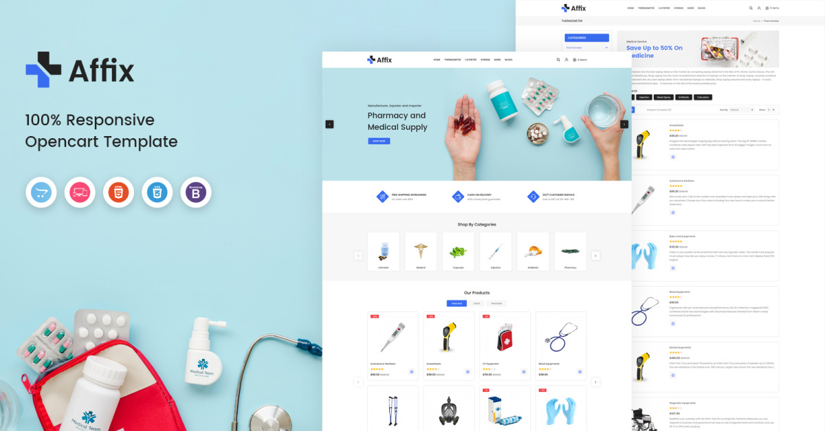 Affix è un modello OpenCart moderno, elegante e completamente reattivo, che diventerà la soluzione migliore per il tuo ospedale online, clinica, medico, farmacia, salute, medicina, medicina, farmacia, ayurvedico, accessori, negozi minimali, di abbigliamento e multiuso. Apporre - Modello OpenCart reattivo medico dall'aspetto gradevole e professionale con combinazione di colori. Ha un bell'aspetto con il suo aspetto pulito e professionale.