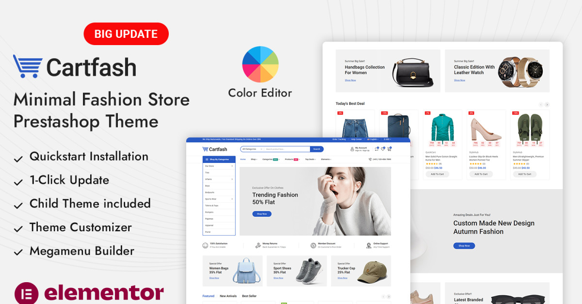 Sviluppato utilizzando il builder Elementor e il modulo di personalizzazione del tema , Cartfash semplifica la progettazione e la personalizzazione del tuo negozio online, anche senza alcuna conoscenza di programmazione. Puoi facilmente modificare i layout, aggiornare i banner, gestire i colori e adattare la tipografia per adattarla perfettamente al tuo brand. Il design completamente responsive e ottimizzato per dispositivi mobili del tema garantisce che il tuo negozio di moda abbia un aspetto impeccabile su tutti i dispositivi, offrendo un'esperienza di acquisto di alta qualità ovunque.