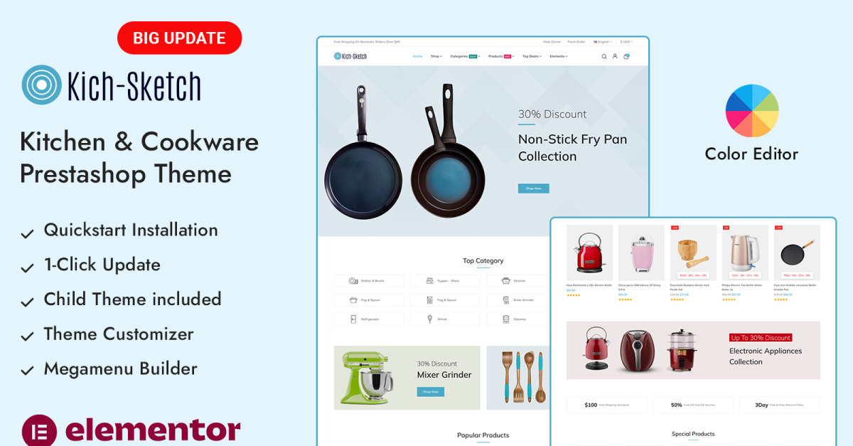 KichSketch – Kitchen Home Appliances Store PrestaShop Theme è una soluzione di eCommerce moderna, pulita e orientata alle prestazioni, progettata per rivenditori di elettrodomestici da cucina, negozi di elettrodomestici, negozi di elettronica e venditori di prodotti per la cucina intelligenti.