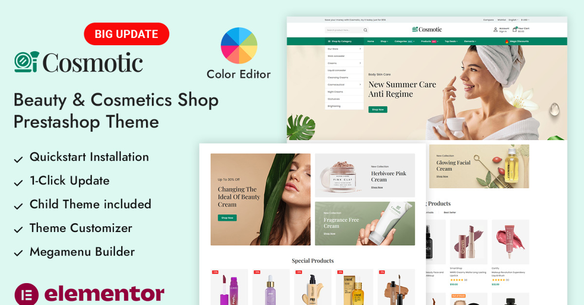 Cosmotic è un tema responsive PrestaShop elegante e moderno, progettato per marchi di bellezza, negozi di cosmetici, centri estetici, boutique del benessere e rivenditori di prodotti per il trucco. Con i suoi toni tenui, il layout fluido e lo stile visivo di alta qualità, Cosmotic crea un'atmosfera di shopping raffinata che mette in risalto l'eleganza e la qualità dei tuoi prodotti di bellezza.