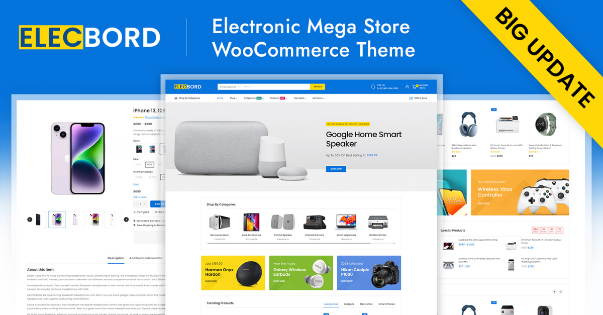 Benvenuto in "Elecbord - Mega Electronics Store", un tema reattivo Elementor WooCommerce all'avanguardia, estremamente potente e flessibile che ti aiuta a costruire il tuo mega negozio di e-commerce per vendere i tuoi prodotti nel mercato online come prodotti elettronici, gadget, articoli digitali, articoli elettronici accessori, articoli di arredamento e anche prodotti di altre categorie. Elecbord vanta un design mega store, fornendo una piattaforma completa e visivamente accattivante per mostrare una vasta gamma di prodotti elettronici. Dai gadget all'avanguardia ai componenti tecnologici essenziali, Elecbord è progettato per soddisfare tutte le esigenze elettroniche dei tuoi clienti.