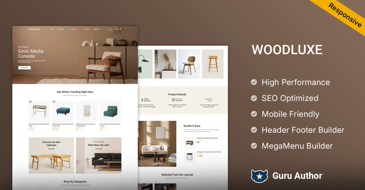 Che tu gestisca un negozio di mobili, uno studio di progettazione di interni o esterni, un negozio di arredamento o una boutique di artigianato , Woodluxe si adatta alle tue esigenze. Il suo design flessibile e la sua solida funzionalità lo rendono la soluzione ideale per creare un negozio di e-commerce professionale e orientato alle vendite.