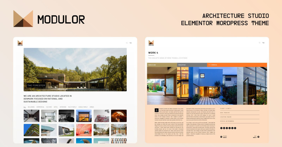 Un template per architetti professionisti è la soluzione ideale per presentare i propri progetti personali. Per questo motivo abbiamo creato il tema MODULOR per WordPress, che utilizza il page builder Elementor, in modo che ogni professionista possa presentare il proprio lavoro in modo semplice, efficiente e visivamente gradevole.
