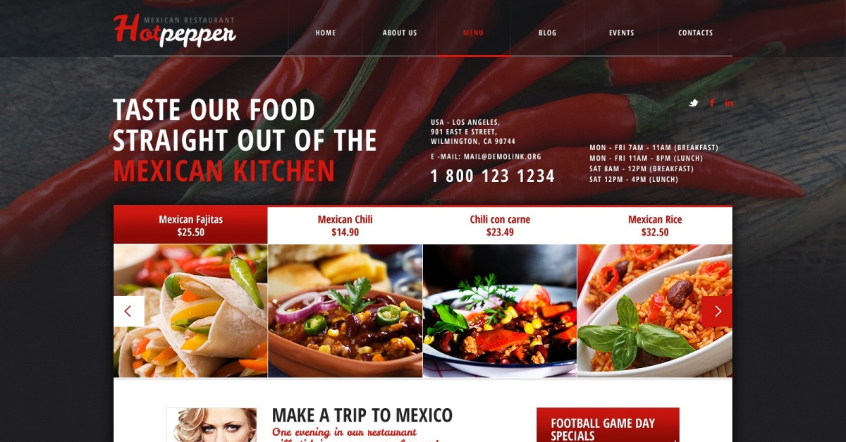 Come far desiderare alle persone di assaggiare il cibo delizioso? Un buon sito di ristoranti con grandi immagini sdolcinate sarebbe un ottimo fattore scatenante. Il design come questo in un appetitoso colore rosso farà venire l'acquolina in bocca agli spettatori. Solo guardando il cursore con i piatti in primo piano, le persone si sentiranno affamate. La grande tipografia nei colori rosso e bianco richiama l'attenzione sui blocchi di informazioni sul luogo e sugli ultimi eventi. Questo design moderno in colori contrastanti è reattivo e significa che più persone possono visualizzarlo su vari dispositivi portatili. Questo parla di una buona promozione del ristorante.