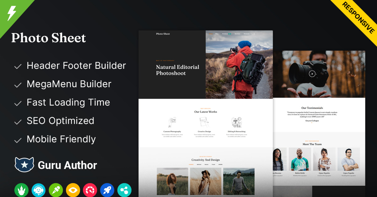 Il tema Photo Sheet offre un design minimalista ma visivamente accattivante, che mette in risalto le tue fotografie. Grazie al layout responsive e ottimizzato per i dispositivi Retina, il tuo sito web apparirà impeccabile su tutti i dispositivi, dai desktop ai dispositivi mobili. La navigazione intuitiva del tema consente ai visitatori di sfogliare rapidamente il tuo portfolio, i servizi e le testimonianze dei clienti, rendendolo la scelta ideale per qualsiasi sito web dedicato alla fotografia.