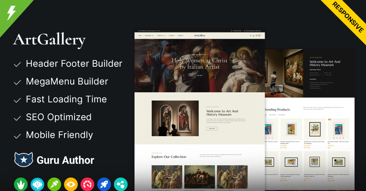 ArtGallery è completamente responsive, il che significa che il tuo sito web apparirà perfettamente su tutti i dispositivi, dai computer fissi ai dispositivi mobili. È inoltre ottimizzato per la velocità, garantendo tempi di caricamento rapidi e un'esperienza utente fluida per i tuoi visitatori.