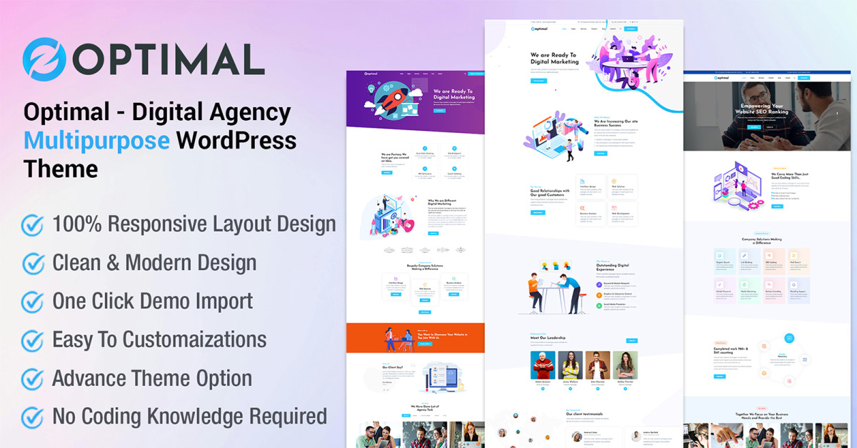 Optimal – Digital Marketing & SEO Agency WordPress Theme incarna modernità, creatività, originalità, pulizia e attrattiva, rendendolo la soluzione ideale per siti web per agenzie SEO, marketing digitale, creative e di sviluppo web, così come per social media marketing, analisi di siti web, servizi di audit SEO, analisi SEO, ricerca di parole chiave o studi digitali. Nei settori in cui il sito web funge da strumento principale per attrarre clienti, Optimal si distingue come la scelta perfetta. Con Optimal Theme, puoi creare un sito web visivamente sbalorditivo, accattivante e all'avanguardia che rifletta la tua visione e professionalità. Il suo design reattivo al 100% garantisce prestazioni impeccabili su tutti i principali browser e dispositivi.
