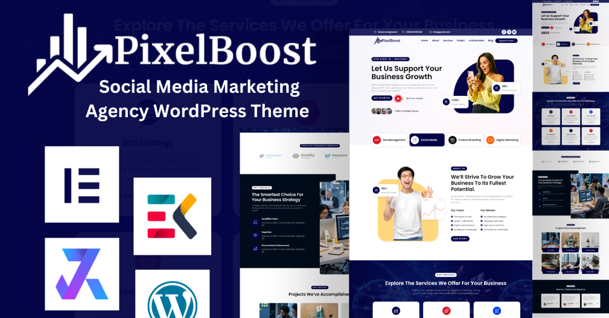 PixelBoost - Tema WordPress per agenzie di marketing sui social media è uno strumento all'avanguardia progettato per agenzie e addetti al marketing che desiderano migliorare la propria impronta digitale. Questo tema è realizzato con le ultime tecnologie web, offrendo un'estetica elegante e moderna combinata con potenti funzionalità. È una scelta ideale per le aziende che si sforzano di rafforzare il proprio marchio e costruire relazioni significative con i clienti.