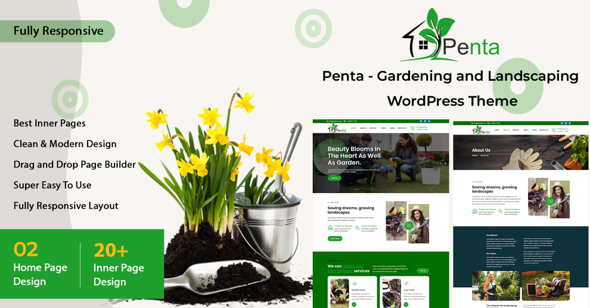 Penta è un tema WordPress splendidamente progettato per servizi di giardinaggio, progettazione paesaggistica e progettazione di spazi all'aperto. È perfetto per sviluppatori di app, aziende di progettazione paesaggistica e privati. Questo tema fornisce tutto il necessario per creare un sito web visivamente sbalorditivo e intuitivo. Penta ha layout personalizzabili, vetrine di servizi e gallerie di portfolio. Ti consente di evidenziare i tuoi progetti e le tue competenze in modo efficace. Il suo design reattivo e la struttura SEO-friendly assicurano che il tuo sito funzioni senza problemi su tutti i dispositivi. Utilizzando il tema Penta potrai attrarre più clienti e stabilire una presenza online unica nel settore della progettazione paesaggistica.