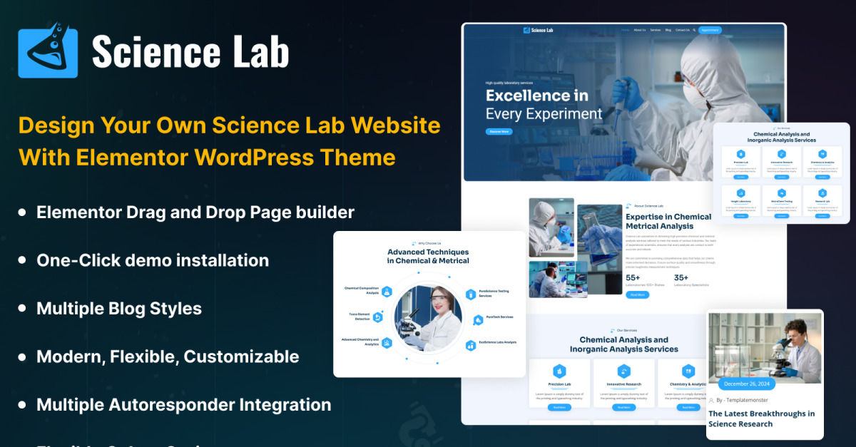 Science Lab è specificamente progettato per semplificare il processo di creazione di un tema WordPress con pochi clic, consentendoti di sviluppare un sito Web distintivo senza la necessità di costosi web designer. Quando si tratta di temi WordPress premium che offrono funzionalità eccezionali e design visivamente sorprendenti, Science Lab non ha eguali. Dotato di una vasta gamma di strumenti personalizzabili e opzioni innovative, ti consente di creare siti Web sbalorditivi, anche se non hai esperienza di programmazione. Esplora il potenziale illimitato per creare un sito Web davvero unico con Science Lab. Questo tema versatile può essere utilizzato per siti Web in qualsiasi nicchia aziendale. Il tema include un sistema di aggiornamento automatico per plugin personalizzati, consentendo agli utenti di aggiornarli senza problemi senza la necessità di reinstallazione. Ulteriori funzionalità eccezionali includono un Mega Menu, Drag & Drop Page Builder, integrazione con Google Analytics e Google AdSense, il potente Redux Framework, Revolution Slider, installazione demo con un clic e opzioni personalizzabili per piè di pagina e intestazione. Supporta anche la funzionalità da destra a sinistra (RTL), è compatibile con più browser, offre più configurazioni della barra laterale e fornisce immagini pronte per la retina. Questa combinazione unica di funzionalità rende Science Lab una soluzione completa per creare siti web professionali e ad alte prestazioni senza sforzo.