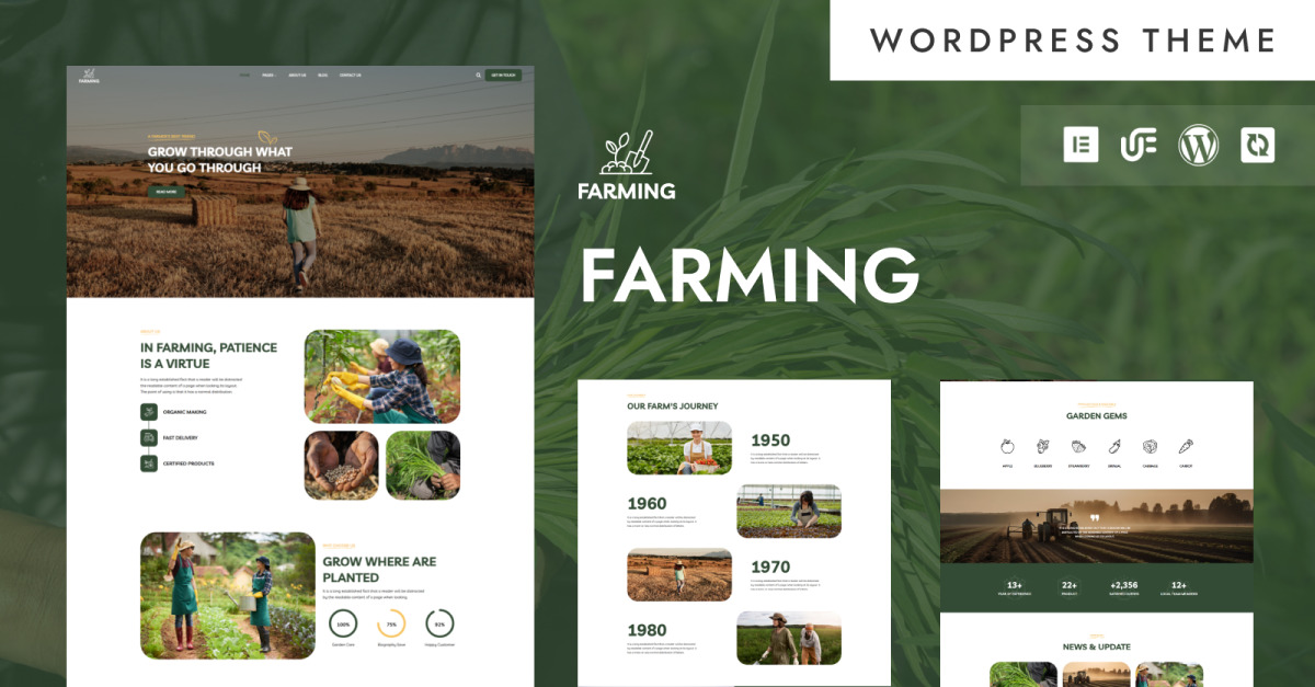 Farming è un template WordPress all'avanguardia, pensato appositamente per l'agricoltura, l'allevamento e le aziende agricole. Che tu sia un agricoltore, un consulente agricolo o un gestore di un'azienda agricola, questo template è la tua porta d'accesso per creare una presenza online professionale che catturi e coinvolga il tuo pubblico.