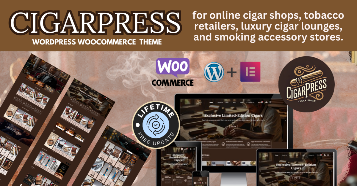 Ecco CigarPress , il tema WordPress WooCommerce Elementor definitivo progettato per negozi di sigari online, rivenditori di tabacco e lounge per fumatori di lusso. Che tu venda sigari di qualità, miscele di tabacco artigianali o accessori per fumatori, CigarPress offre tutto ciò di cui hai bisogno per creare un negozio online sofisticato e di facile utilizzo.