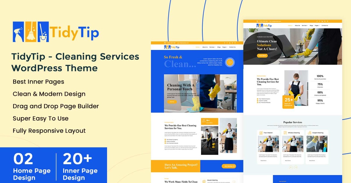 TidyTip è un tema WordPress elegante e moderno, pensato per i fornitori di servizi di pulizia che desiderano creare una presenza online professionale e accattivante. Ha un layout facile da personalizzare e offre sezioni pronte all'uso per presentare servizi, testimonianze dei clienti, prezzi e moduli di contatto. TidyTip ti aiuta a entrare in contatto con potenziali clienti senza sforzo. Questo tema è progettato per essere responsive e ottimizzato per i motori di ricerca (SEO), e garantisce che il tuo sito web abbia un aspetto impeccabile su qualsiasi dispositivo, aumentando al contempo la visibilità nei risultati di ricerca. TidyTip è perfetto sia per le aziende affermate che per le startup. Ti permette di creare un sito web unico che si distingue, crea fiducia e attrae più clienti con facilità.