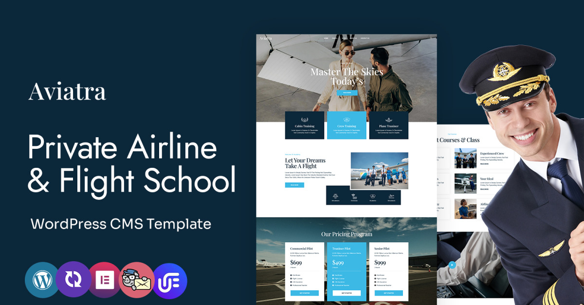Aviatra - Tema WordPress Elementor multiuso per compagnie aeree private e scuole di volo