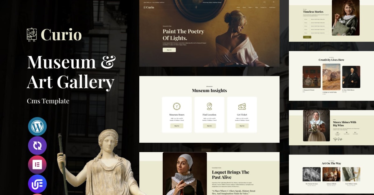 Curio è un tema WordPress raffinato e immersivo, creato esclusivamente per musei, istituzioni culturali e gallerie d'arte contemporanea che desiderano presentare collezioni, mostre e archivi in modo sofisticato e coinvolgente. Con il suo design elegante, layout visivamente bilanciati e animazioni fluide basate su Slider Revolution, Curio crea un'esperienza curata che rispecchia la quieta meraviglia di passeggiare in una galleria.