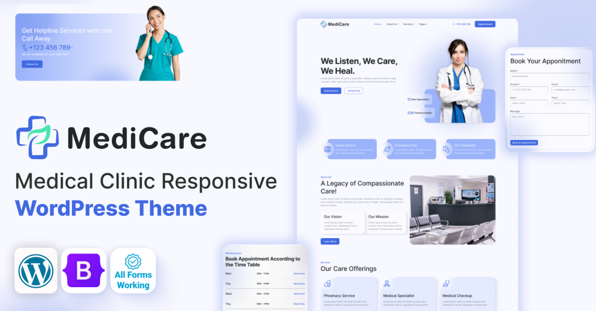 Questo tema medico è completamente responsive e ottimizzato per tutti i dispositivi, garantendo ai pazienti un'esperienza fluida, indipendentemente dal fatto che visitino da cellulare, tablet o desktop. Il sistema di prenotazione degli appuntamenti integrato aiuta cliniche e medici a semplificare la pianificazione online dei pazienti, mentre le pagine dettagliate del profilo medico , gli elenchi dei servizi e i moduli di contatto semplificano la comunicazione e la ricerca per gli utenti. Medicare supporta anche WooCommerce , quindi le cliniche possono facilmente offrire consulenze a pagamento, vendere prodotti medici o accettare pagamenti online con facilità. Ottimizzato per velocità e SEO, questo tema è la soluzione completa per creare un sito web medico affidabile e dall'aspetto professionale.