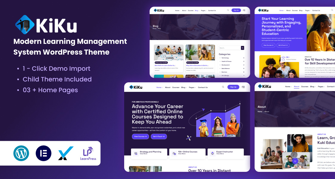 KiKuLMS è un moderno tema WordPress per LMS progettato per la formazione online, i centri di formazione e le piattaforme di corsi. Sviluppato con Elementor, offre un'esperienza drag-and-drop fluida, solidi strumenti di quiz, dashboard per gli insegnanti e monitoraggio dei progressi degli studenti, rendendolo perfetto per la creazione di un sito web di eLearning completamente funzionale.