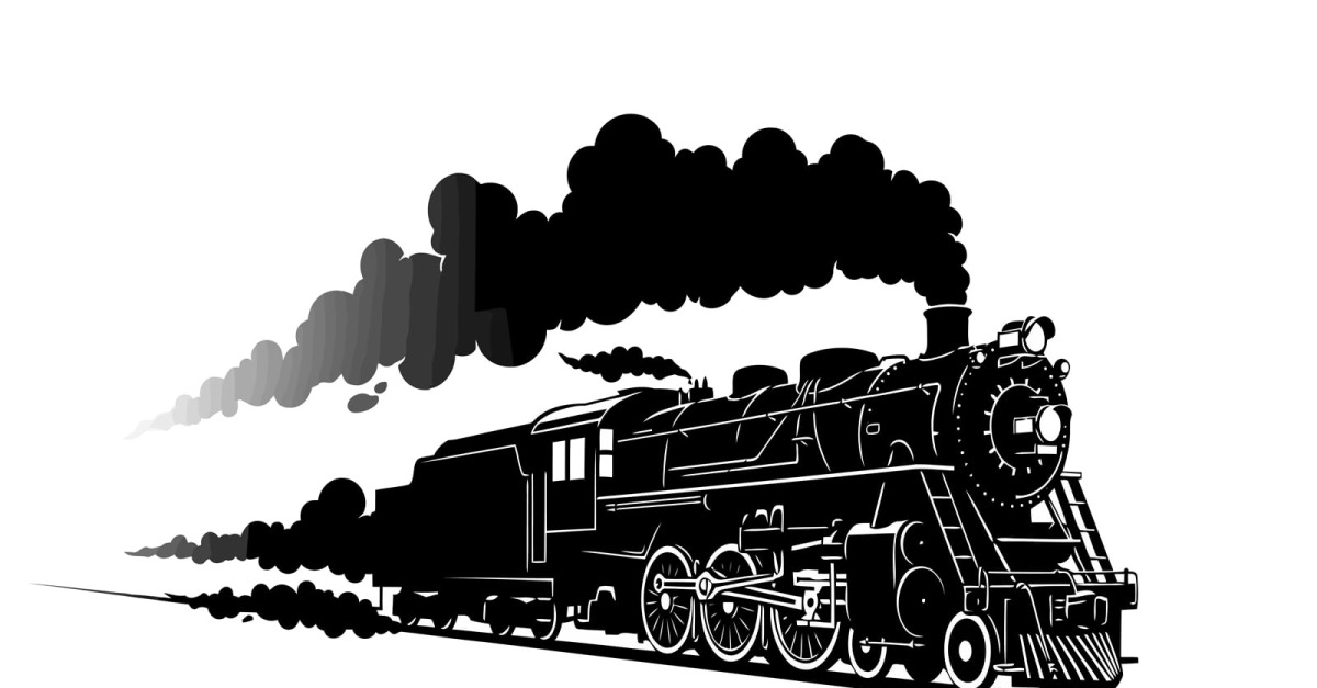 Sagoma di locomotiva a vapore nera con fumo isolata su sfondo bianco