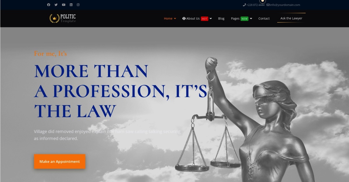 Your Web Site displays your digital presence in Law, and a well-prepared legal site helps you increase accessibility. Remember that Web sites are your face on the Internet. Users who visit your site get the first impression of the cases you have won, your resume, products, services and your law firm, thanks to your website. A well-designed website makes you look stronger and more reliable. If you are a lawyer or have a law firm, have modern and stylish sites through Politic Template.