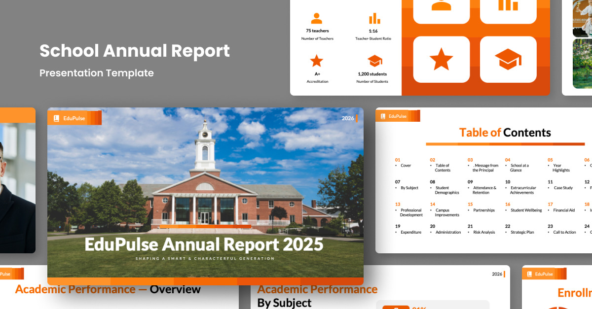 Ideal for school management, foundation boards, or public presentations, it helps communicate success metrics, vision, and community engagement with elegance and precision.