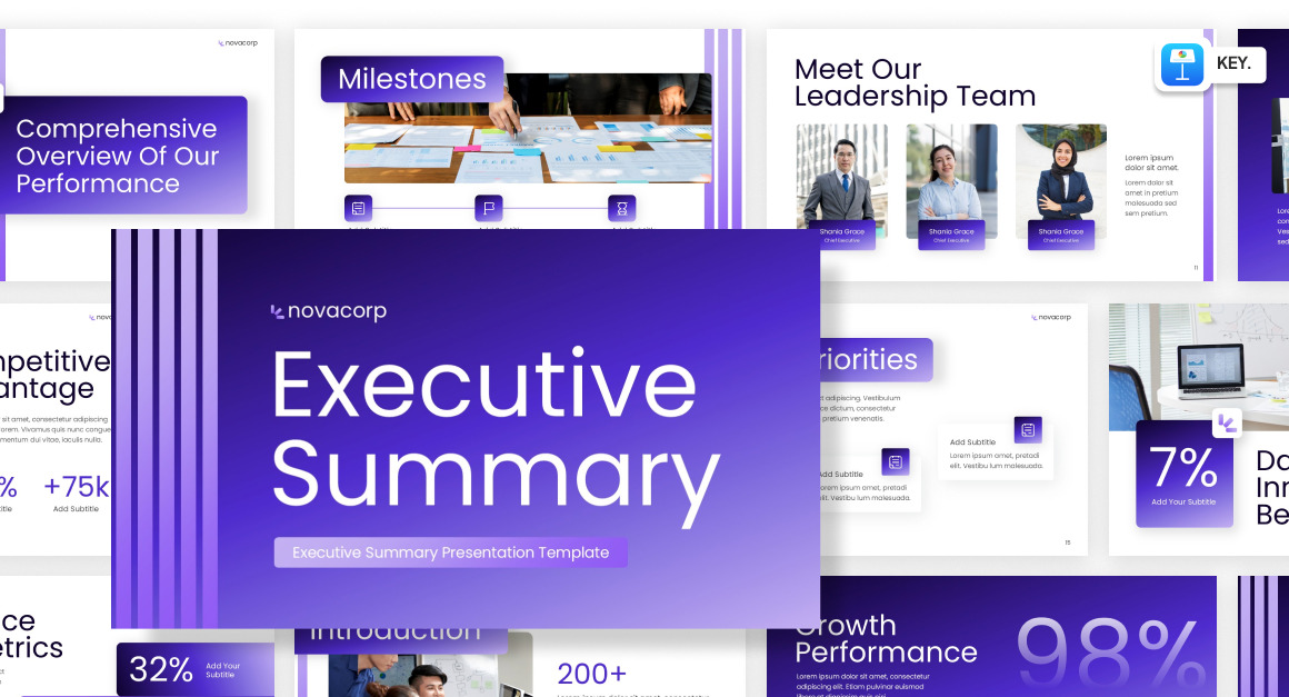 Elevate your presentations with the “Executive Summary” Keynote template. With 20 professionally designed slides, full animations, and easy editing capabilities, this template empowers you to create captivating and impactful presentations effortlessly. Impress your audience, deliver your message with style, and make a lasting impact. Download now and take your presentations to new heights!