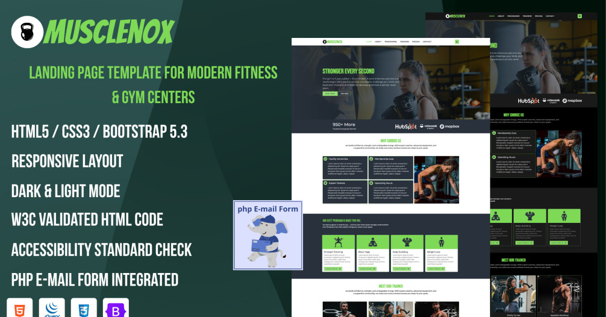 Musclenox is a modern, energetic, and fully responsive Gym & Fitness HTML Template built to power up your online presence. Designed with precision for gyms, fitness centers, personal trainers, and bodybuilding clubs, it offers a bold look that motivates users to achieve their fitness goals. Crafted using HTML5, CSS3, Bootstrap 5, and jQuery, Musclenox ensures performance, flexibility, and a visually engaging experience. It also includes Dark and Light Mode options that users can toggle easily, along with PHP Mail Integration for functional and hassle-free contact forms. Musclenox delivers a strong and dynamic layout that highlights your programs, trainers, membership plans, and fitness philosophy — perfect for attracting new members and building trust with potential clients.