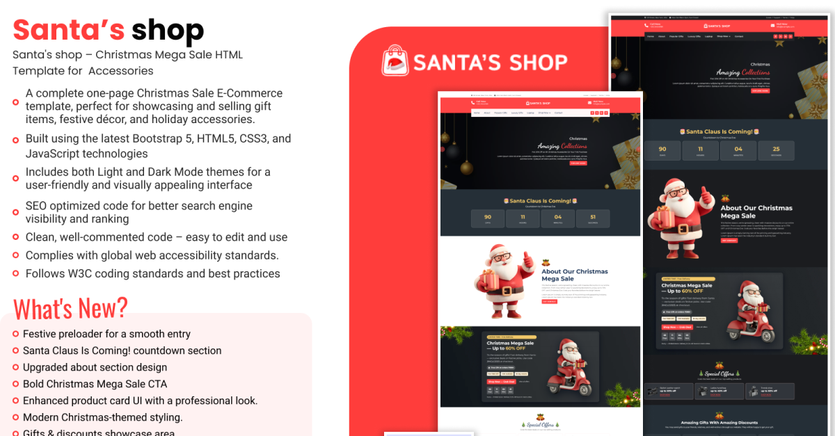Festive preloader for a smooth entry Santa Claus Is Coming! countdown section Dedicated Special Christmas Offers area to boost conversions Upgraded about section design Enhanced product card UI with a professional holiday and festival touch Upgraded Call-to-Action sections for stronger impact Integrated light/dark mode variations for user customization Refined CSS styling across all sections with a cohesive Christmas theme SEO and accessibility enhancements for higher search rankings Bold Christmas Mega Sale CTA Modern Christmas-themed styling. Gifts & discounts showcase area. Fully functional PHP contact form for instant holiday inquiries