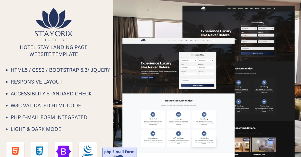 Stayorix is a premium hotel and resort booking HTML template that brings elegance, comfort, and convenience together in one luxurious digital experience. Designed for resorts, hotels, villas, guesthouses, and travel accommodations, Stayorix helps you showcase your property and accept guest bookings seamlessly. With dual dark and light mode themes, integrated PHP booking form, and a modern, responsive design, Stayorix ensures your visitors enjoy a smooth and immersive browsing experience — whether they’re exploring your amenities, viewing suites, or reserving a stay.