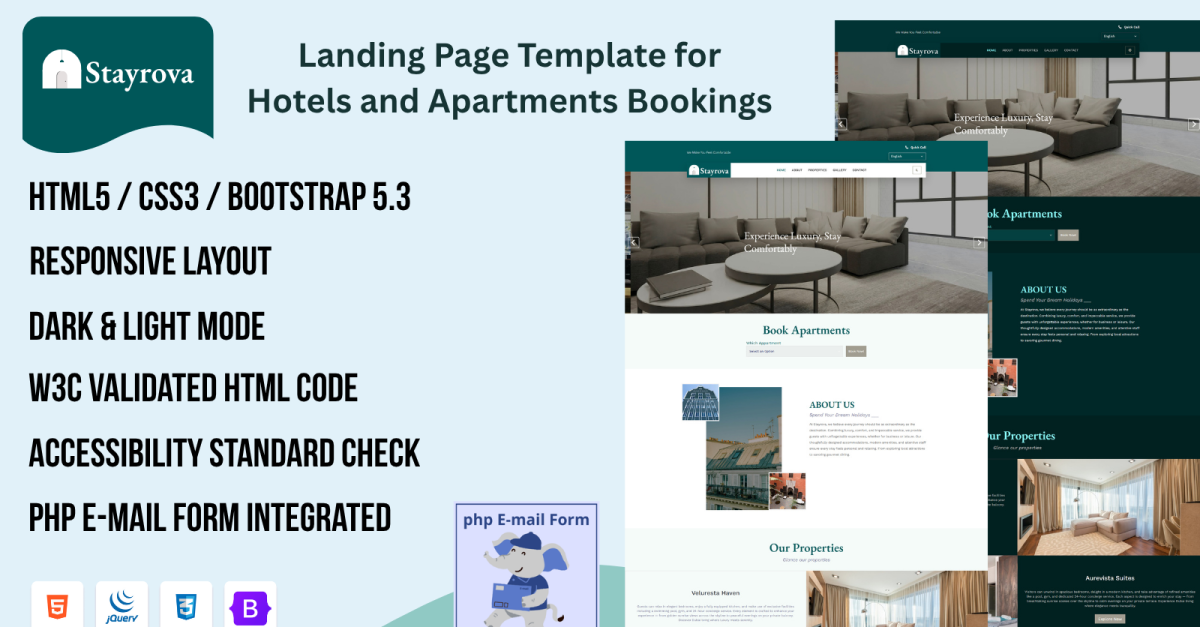 Stayrova is a premium, elegant, and fully responsive Hotel, Homestay & Apartment Booking HTML Template — designed to bring luxury hospitality and modern living to life online. Built with precision using HTML5, CSS3, Bootstrap 5, and jQuery, it provides a sophisticated user experience for showcasing hotels, homestays, villas, apartments, and resort properties. This beautifully designed template features a Dark & Light Mode switch, allowing visitors to personalize their browsing experience. With its integrated PHP mail function, your contact forms work flawlessly out of the box — no extra configuration required. Stayrova's refined aesthetic, intuitive navigation, and responsive layout make it the perfect choice for hotel booking websites, luxury rentals, serviced apartments, and property listing platforms.