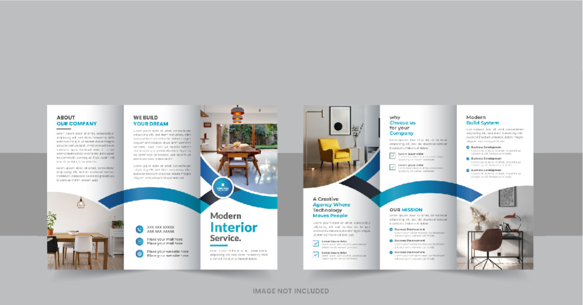 Interieur driebladige brochure, onroerend goed of meubilair driebladige brochure sjabloonontwerp