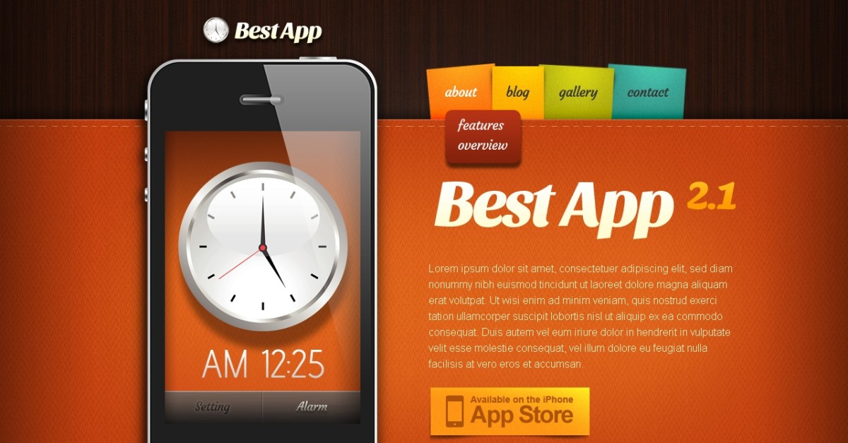 Skeuomorfisch ontwerp zoals dit is echt cool voor het presenteren van mobiele apps. De lay-out is opgebouwd rond de iPhone-afbeelding die eruitziet als de echte. De donkere houten achtergrond is een ander skeuomorf element dat de bezoekers zo vertrouwd voorkomt en voor een aangename sfeer zorgt. Stralende kleuren, grote typografie, heldere sociale iconen - het thema ziet er ongetwijfeld aantrekkelijk uit. Het past bij blogs, portfolio's, forumsecties en biedt crossbrowser-compatibiliteit, wat een goede gewoonte is in het web van vandaag.