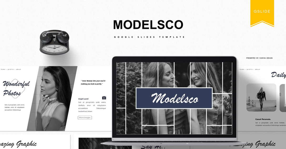 Dit is **Modelsco | Google Presentaties-sjabloon** - Download het nu!, een geweldige Google Presentaties-sjabloon voor alle zakelijke of persoonlijke behoeften.